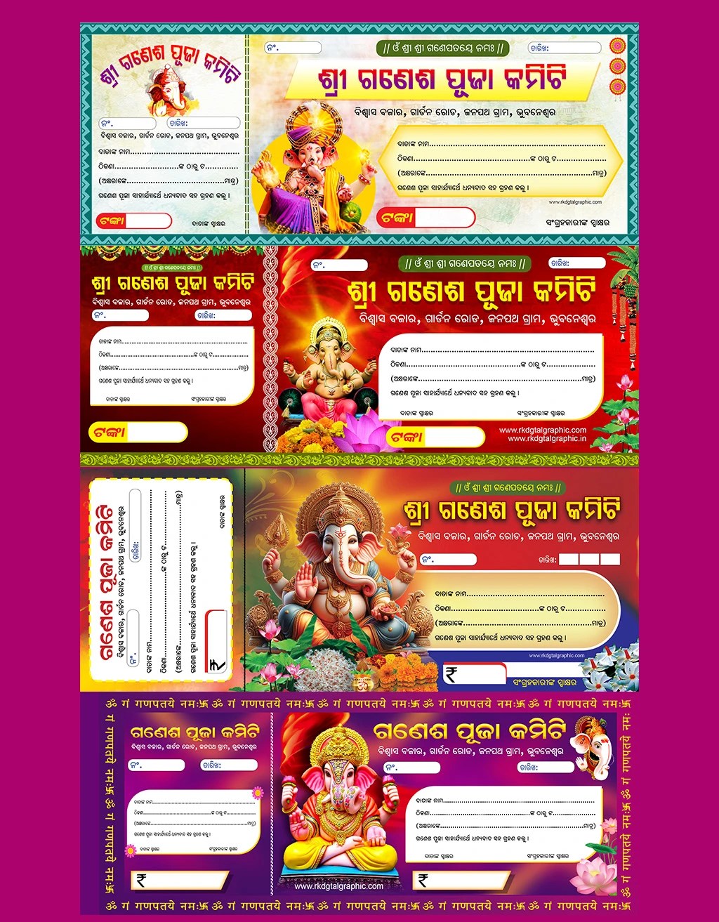 Celebrate Ganesh Chaturthi in a professional and organized way with our Ganesh Puja Money Receipt PSD Template Pack. This premium pack includes 4 unique donation receipt designs in 10×4 inch size, created specially for Ganesh Puja 2025. Each design is fully customizable in Adobe Photoshop and features vibrant devotional themes with Lord Ganesha illustrations and traditional patterns.