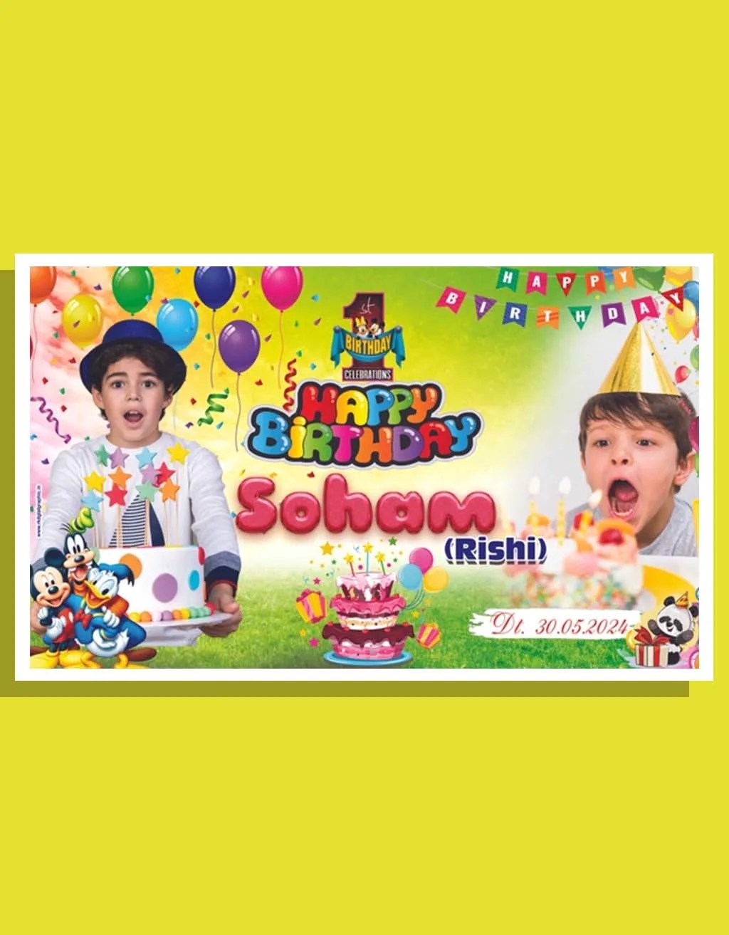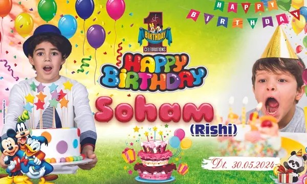 Introducing our Editable Birthday Flex Banner PSD Template (5×3 feet), inspired by Soham’s fun-filled birthday celebration. Perfectly crafted for boys’ birthday parties, this Photoshop template includes balloons, cakes, cartoon characters (Mickey, Panda, etc.), and space for custom photos & names.