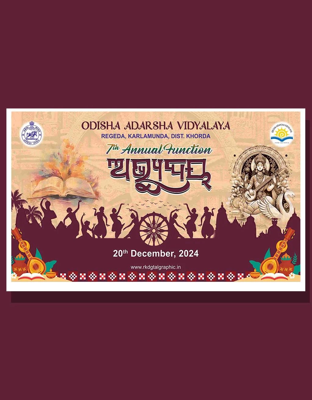 Presenting the Odisha Adarsha Vidyalaya Annual Function PSD Template (10×18 Feet) – designed specially for schools organizing annual day celebrations, cultural programs, or Saraswati Puja events.
